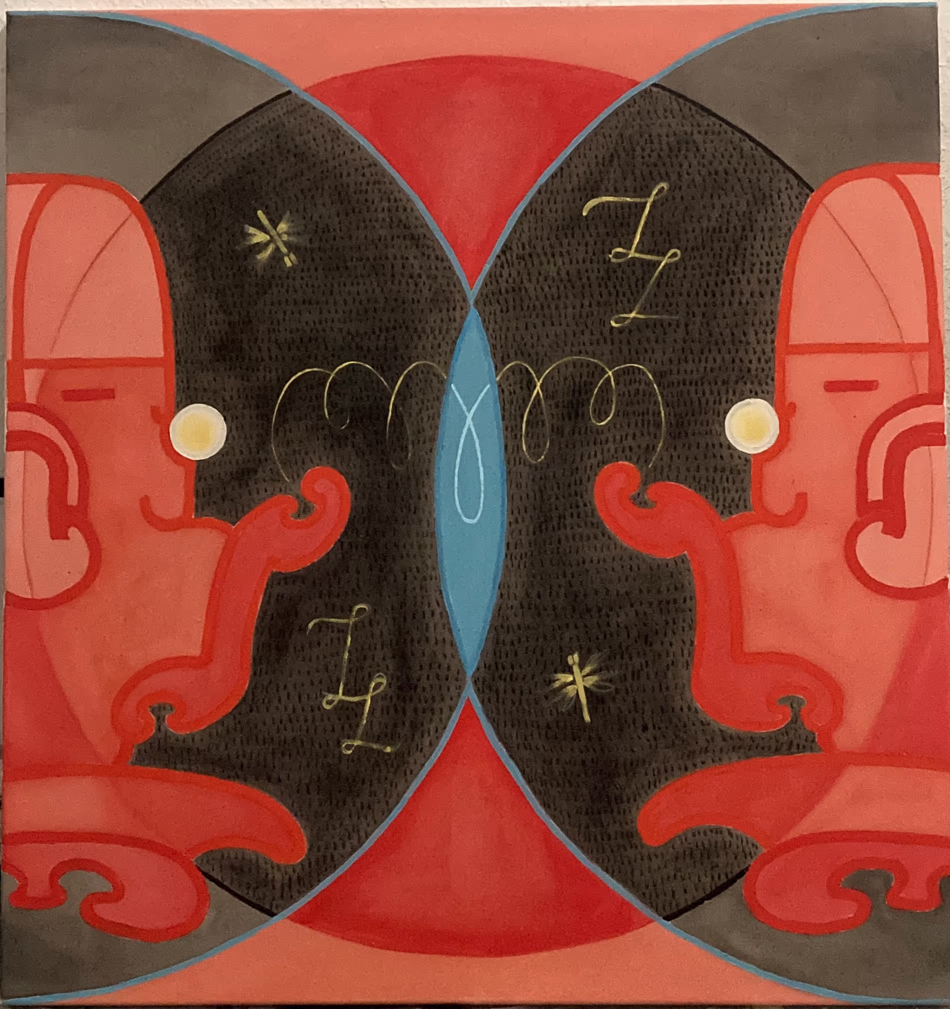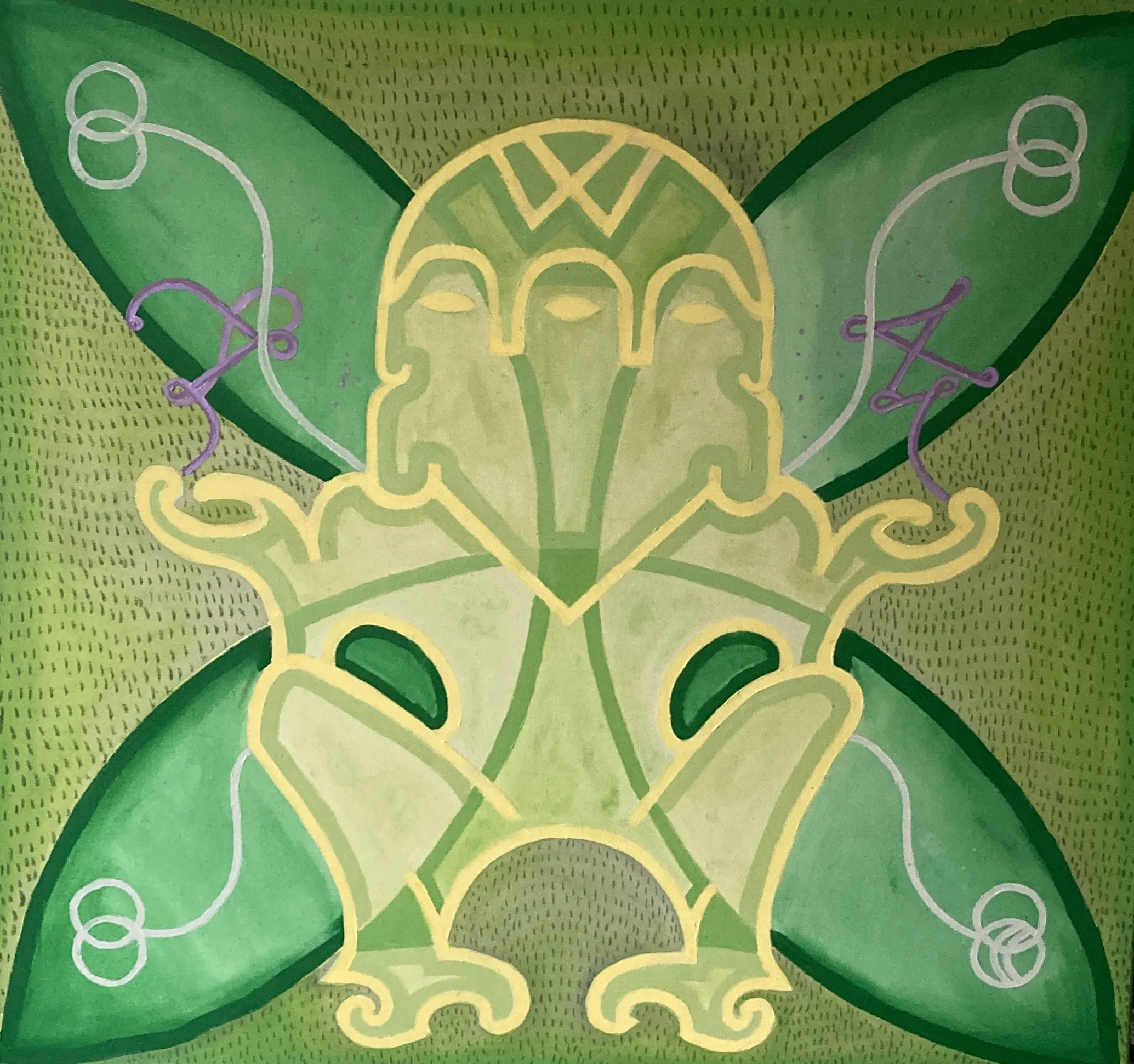 Pre-Columbian anthropomorphic references and vibrant compositions question the monopoly of the christian representation of the divine as open the door for an intangible world operated by the same laws that govern the universe. My design background brings a vectorial yet organic style that finds through color an invitation to be playful, folkloric, latino.
